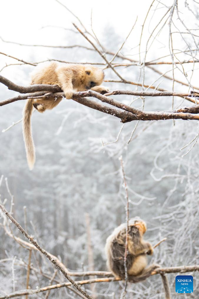 This photo taken on Jan. 19, 2026 shows golden snub-nosed monkeys at the Dalongtan Golden Monkey Research Center in Shennongjia National Park under the Shennongjia Forestry District, central China's Hubei Province. The district is now home to 11 populations of golden snub-nosed monkeys, totaling 1,618 individuals, with a habitat area of 401 square kilometers. (Xinhua/Du Zixuan)