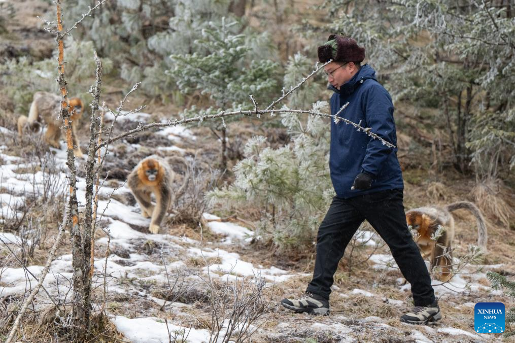 A researcher checks the condition of golden snub-nosed monkeys at the Dalongtan Golden Monkey Research Center in Shennongjia National Park under the Shennongjia Forestry District, central China's Hubei Province, Jan. 19, 2026. The district is now home to 11 populations of golden snub-nosed monkeys, totaling 1,618 individuals, with a habitat area of 401 square kilometers. (Xinhua/Du Zixuan)