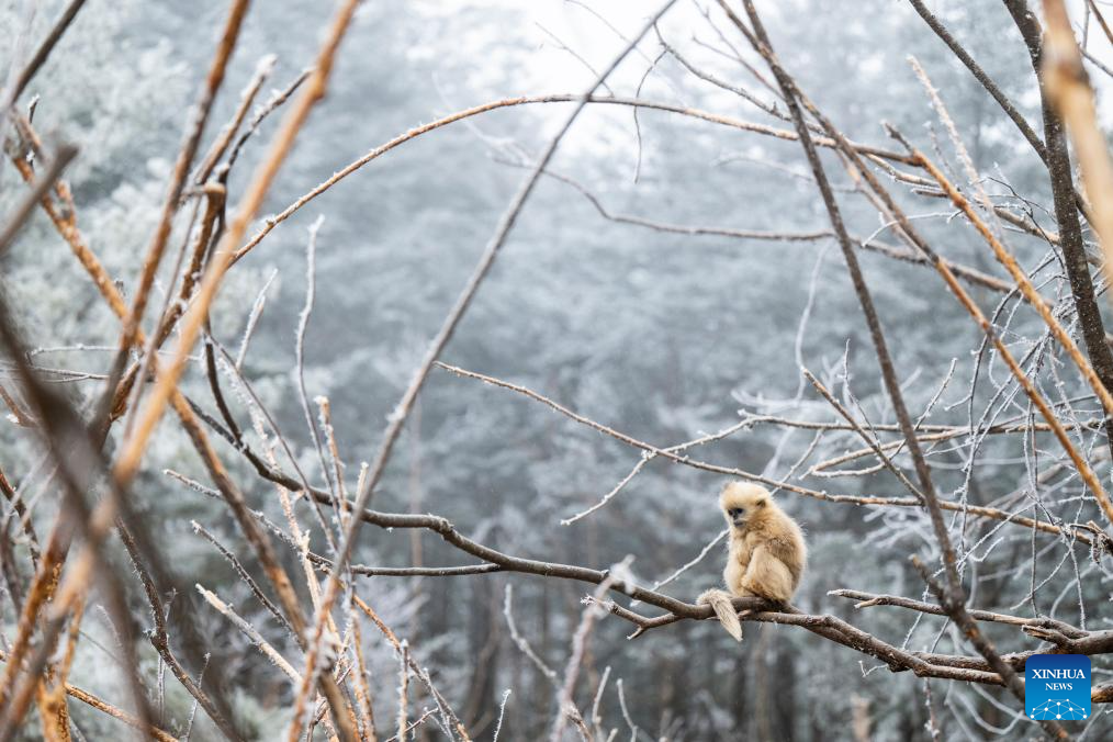 This photo taken on Jan. 19, 2026 shows a golden snub-nosed monkey at the Dalongtan Golden Monkey Research Center in Shennongjia National Park under the Shennongjia Forestry District, central China's Hubei Province. The district is now home to 11 populations of golden snub-nosed monkeys, totaling 1,618 individuals, with a habitat area of 401 square kilometers. (Xinhua/Wu Zhizun)