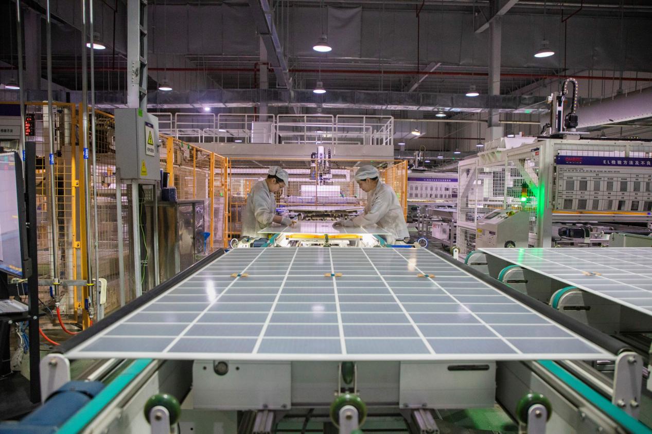 A 5G-enabled digital production line for photovoltaic panels runs at full capacity in a workshop of a new energy technology company in Suqian, east China's Jiangsu province. (Photo/Liu Ye)