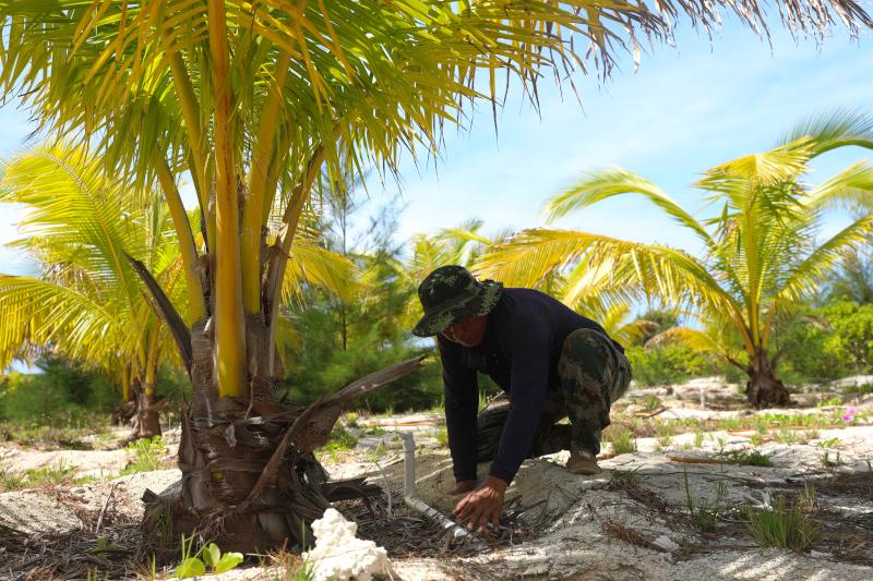 Irrigation pipelines are installed to water coconut palms on Xishazhou Island. (Photo/Wu Yatie)
