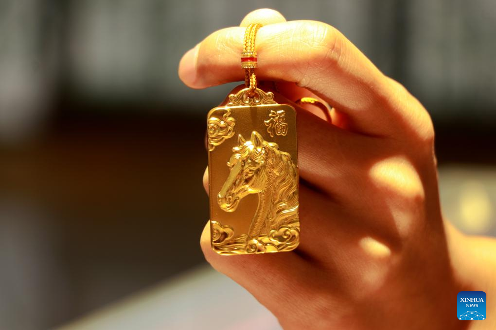 This photo taken on Jan. 16, 2026 shows a Year-of-the-Horse-themed gold product at a store in Congjiang County, southwest China's Guizhou Province. (Photo by Luo Jinglai/Xinhua)