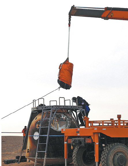 The spacewalk suit is lifted out of the return capsule by a crane following its safe landing on Monday. CHENG LIN/FOR CHINA DAILY