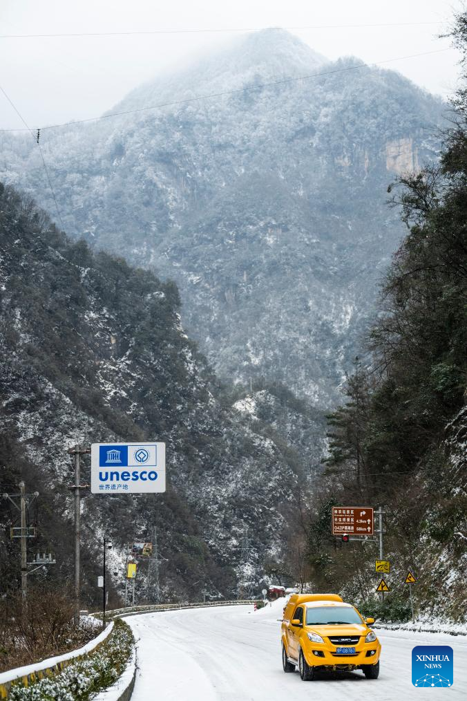 Workers taking a vehicle patrol for power supply problems in Muyu Town, Shennongjia Forestry District of central China's Hubei Province, Jan. 21, 2026. Facing widespread low-temperature with severe icing on power lines in some high-altitude areas in Hubei Province, power maintenance staff conducted patrols to ensure the stable operation of the power grid. (Xinhua/Wu Zhizun)