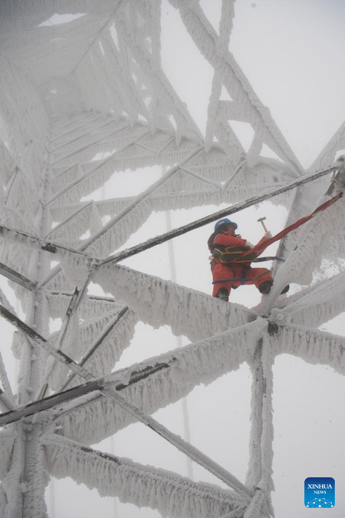 A worker deices on a power tower in Zouma Town of Hefeng County, central China's Hubei Province, Jan. 21, 2026. Facing widespread low-temperature with severe icing on power lines in some high-altitude areas in Hubei Province, power maintenance staff conducted patrols to ensure the stable operation of the power grid. (Photo by Yang Shunpi/Xinhua)