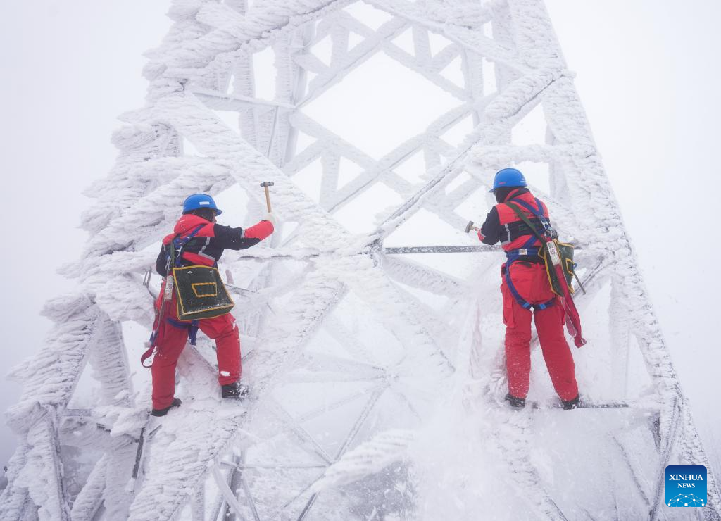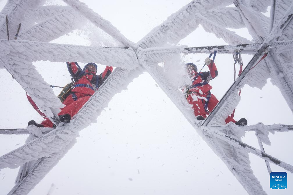 Power maintenance staff ensure power grid stability amid severe icing in China's Hubei