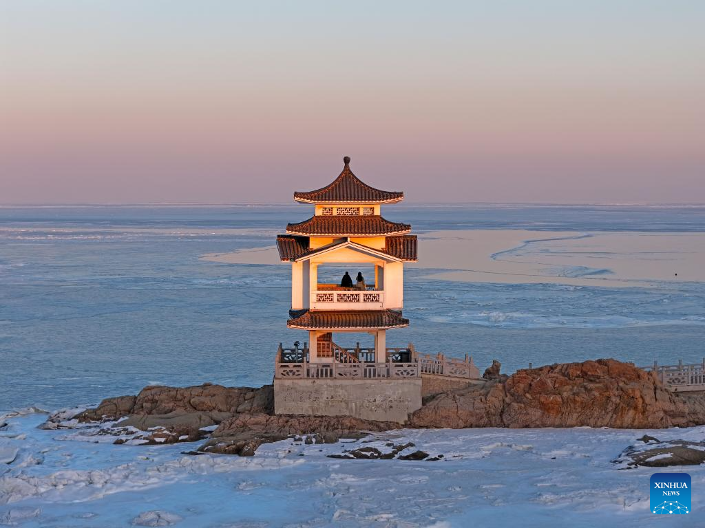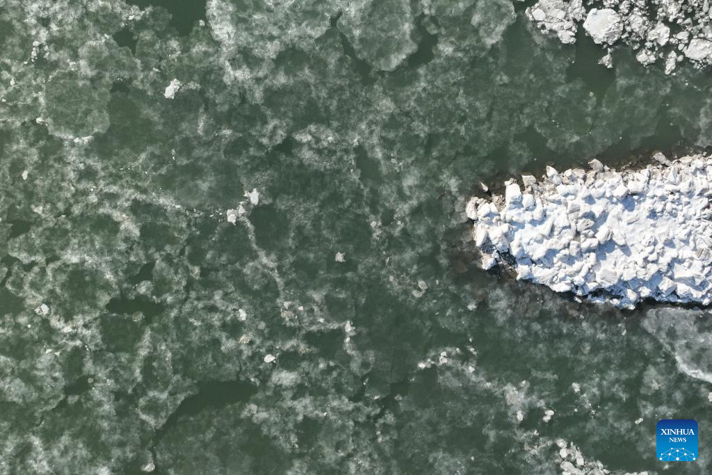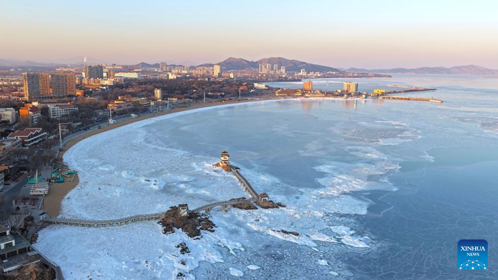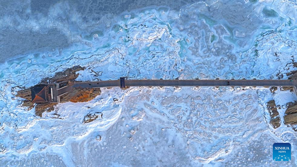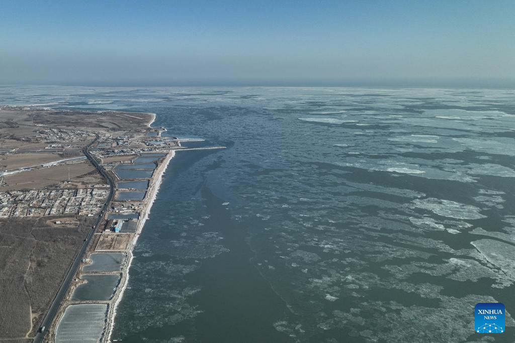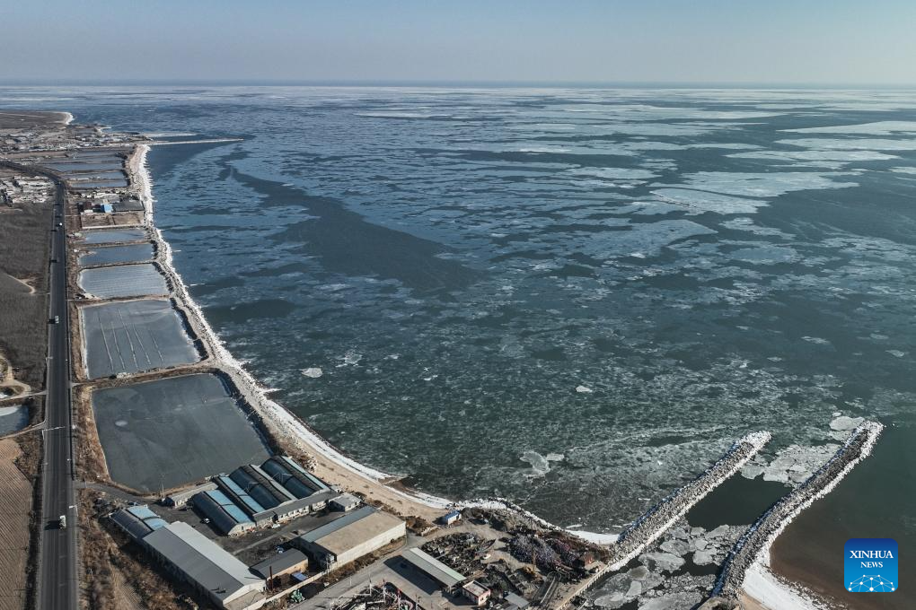 A drone photo taken on Jan. 21, 2026 shows a view over sea ice in Suizhong County of Huludao City, northeast China's Liaoning Province. (Xinhua/Pan Yulong)