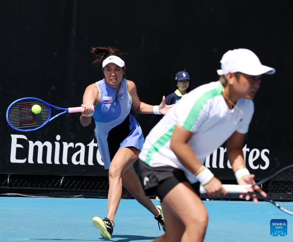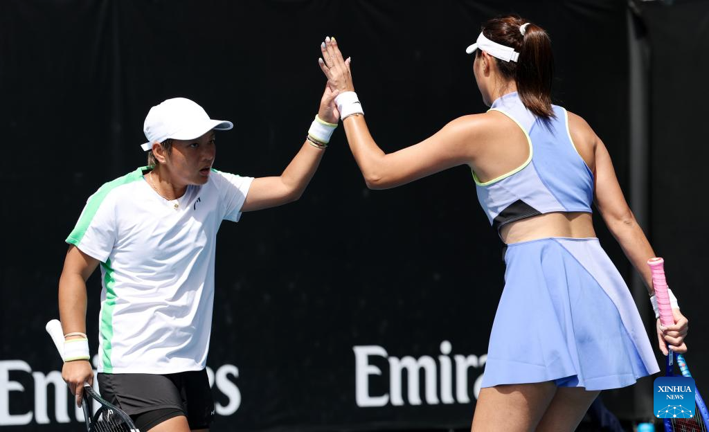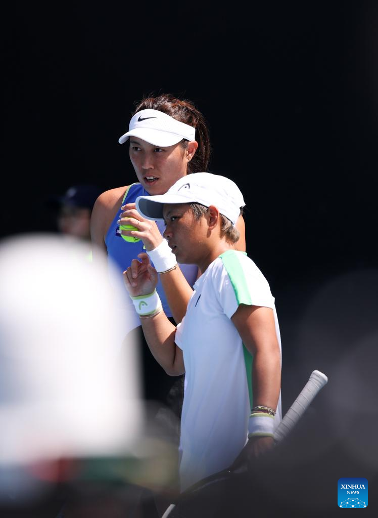 Jiang Xinyu/Chan Hao-Ching (rear) compete during the women's doubles 1st round match between Jiang Xinyu (China)/Chan Hao-Ching (Chinese Taipei) and Anna Blinkova (Russia)/Kamilla Rakhimova (Uzbekistan) at the Australian Open tennis tournament in Melbourne, Australia, Jan. 22, 2026. (Xinhua/Ma Ping)