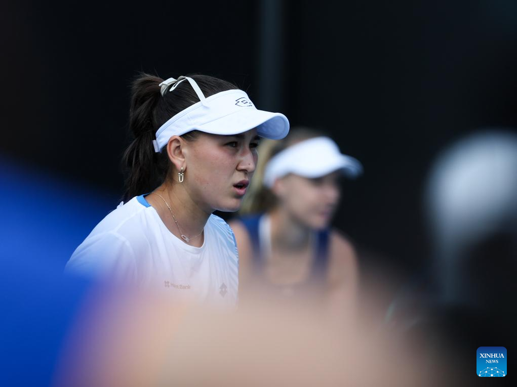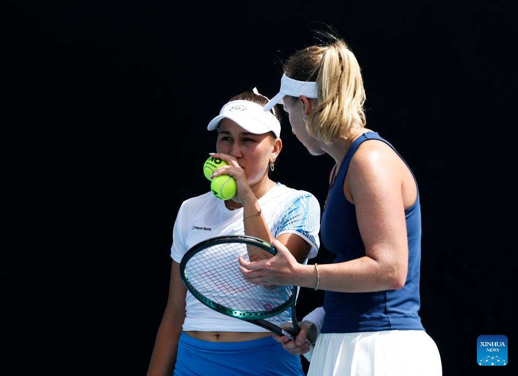 Anna Blinkova/Kamilla Rakhimova (front) react during the women's doubles 1st round match between Jiang Xinyu (China)/Chan Hao-Ching (Chinese Taipei) and Anna Blinkova (Russia)/Kamilla Rakhimova (Uzbekistan) at the Australian Open tennis tournament in Melbourne, Australia, Jan. 22, 2026. (Xinhua/Ma Ping)
