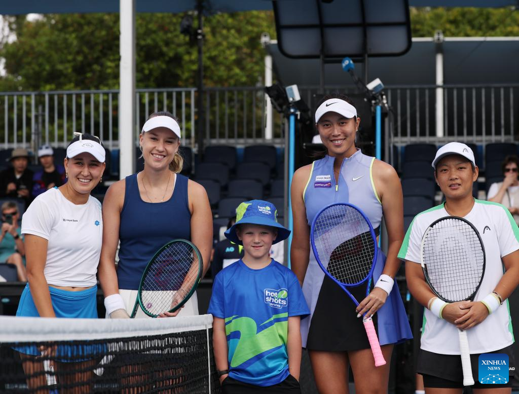 Jiang Xinyu (1st R)/Chan Hao-Ching (2nd R) and Anna Blinkova (2nd L)/Kamilla Rakhimova pose for photos before the women's doubles 1st round match between Jiang Xinyu (China)/Chan Hao-Ching (Chinese Taipei) and Anna Blinkova (Russia)/Kamilla Rakhimova (Uzbekistan) at the Australian Open tennis tournament in Melbourne, Australia, Jan. 22, 2026. (Xinhua/Ma Ping)