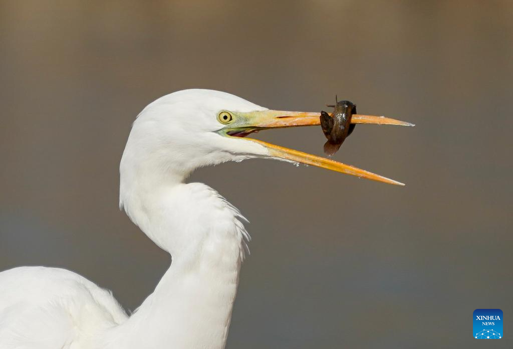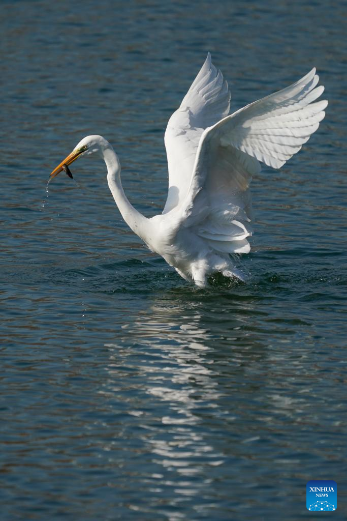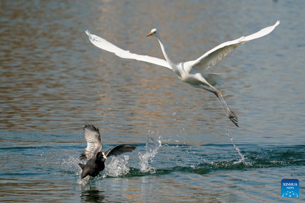 An egret forages at a wetland park in Taiyuan, north China's Shanxi Province, Jan. 22, 2026. An increasing number of migratory birds have chosen to rest and winter at the Fenhe River basin thanks to continuous improvements in the ecological environment in recent years. (Xinhua/Yang Chenguang)