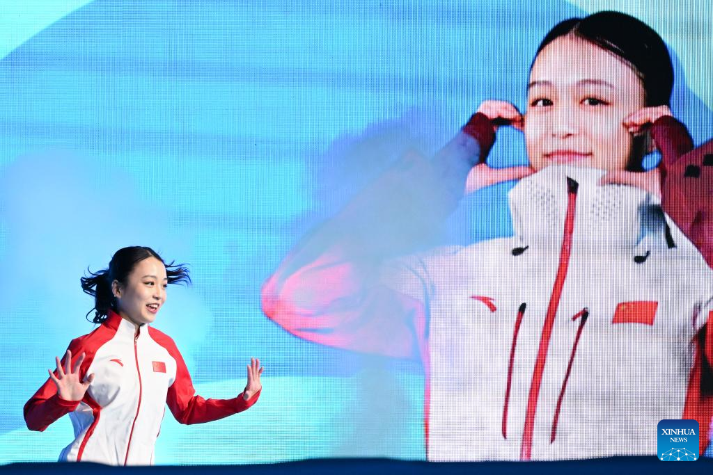 Zhu Yi of China waves to spectators before the women's short program at the ISU Four Continents Figure Skating Championships in Beijing, China, Jan. 22, 2026. (Xinhua/Ju Huanzong)