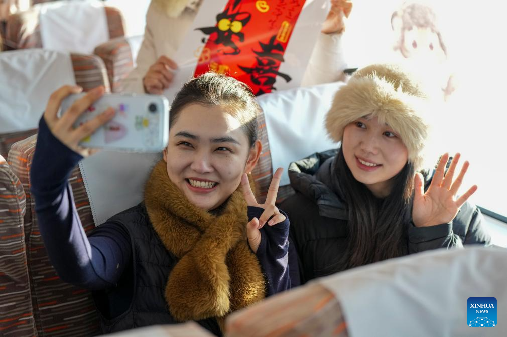 Passengers take a selfie on bullet train G902 from Harbin, northeast China's Heilongjiang Province, to Beijing, capital of China, on Jan. 22, 2026. The Beijing-Harbin high-speed railway marked the 5th anniversary of its full operation on Thursday. At 1,198 kilometers, the rail line links China's northeastern provinces of Liaoning, Jilin and Heilongjiang with the capital Beijing. (Xinhua/Wang Song)