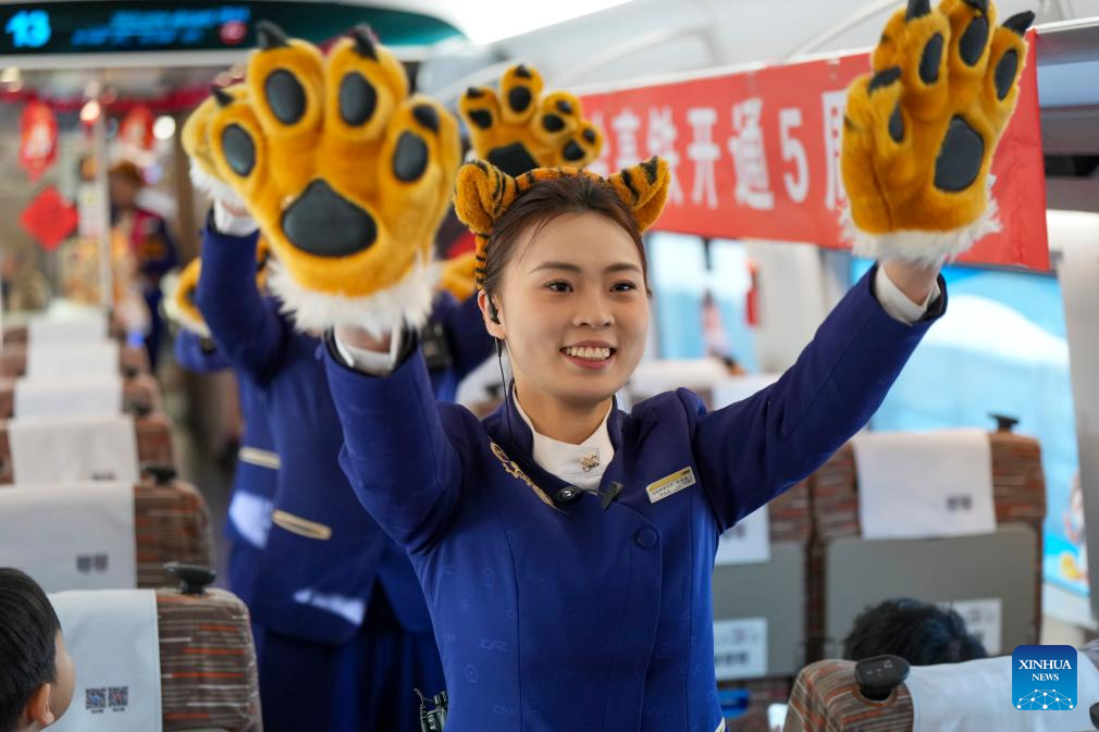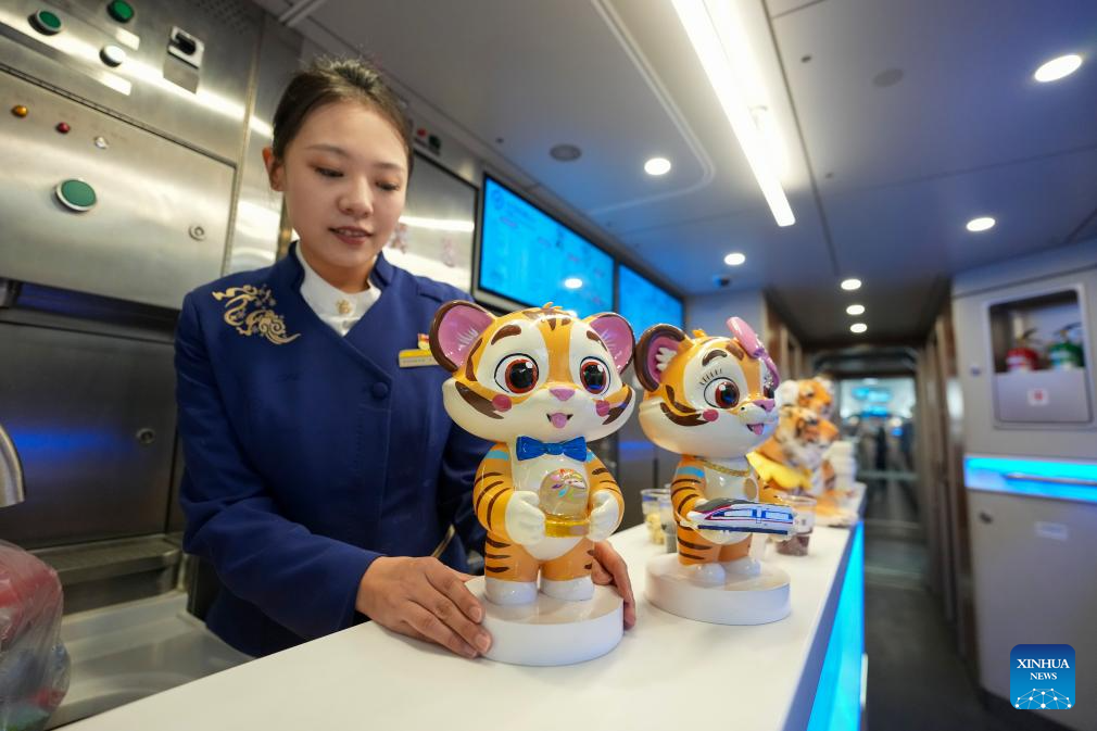 A train attendant displays Siberian Tiger figurines on bullet train G902 from Harbin, northeast China's Heilongjiang Province, to Beijing, capital of China, on Jan. 22, 2026. The Beijing-Harbin high-speed railway marked the 5th anniversary of its full operation on Thursday. At 1,198 kilometers, the rail line links China's northeastern provinces of Liaoning, Jilin and Heilongjiang with the capital Beijing. (Xinhua/Wang Song)