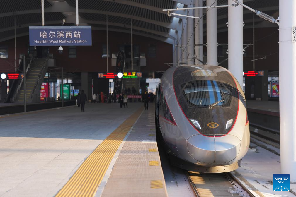 Passengers prepare to board the bullet train G902 at the Harbin West Railway Station in Harbin, northeast China's Heilongjiang Province, on Jan. 22, 2026. The Beijing-Harbin high-speed railway marked the 5th anniversary of its full operation on Thursday. At 1,198 kilometers, the rail line links China's northeastern provinces of Liaoning, Jilin and Heilongjiang with the capital Beijing. (Xinhua/Wang Song)