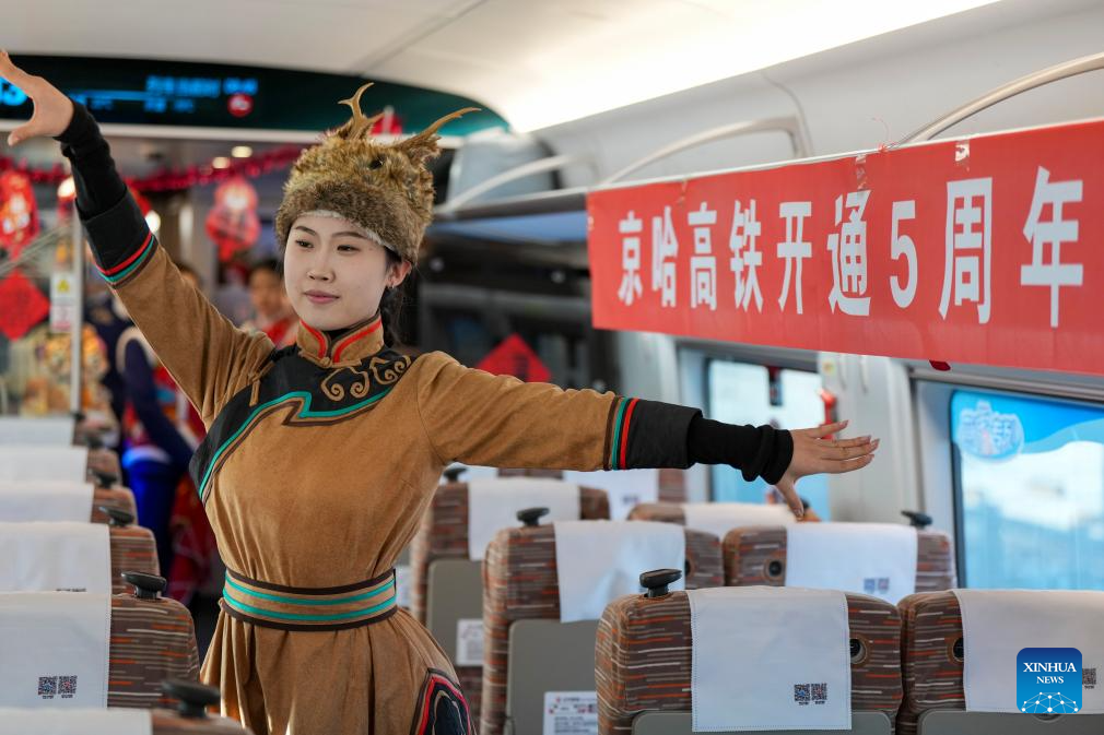 A train attendant performs on bullet train G902 from Harbin, northeast China's Heilongjiang Province, to Beijing, capital of China, on Jan. 22, 2026. The Beijing-Harbin high-speed railway marked the 5th anniversary of its full operation on Thursday. At 1,198 kilometers, the rail line links China's northeastern provinces of Liaoning, Jilin and Heilongjiang with the capital Beijing. (Xinhua/Wang Song)