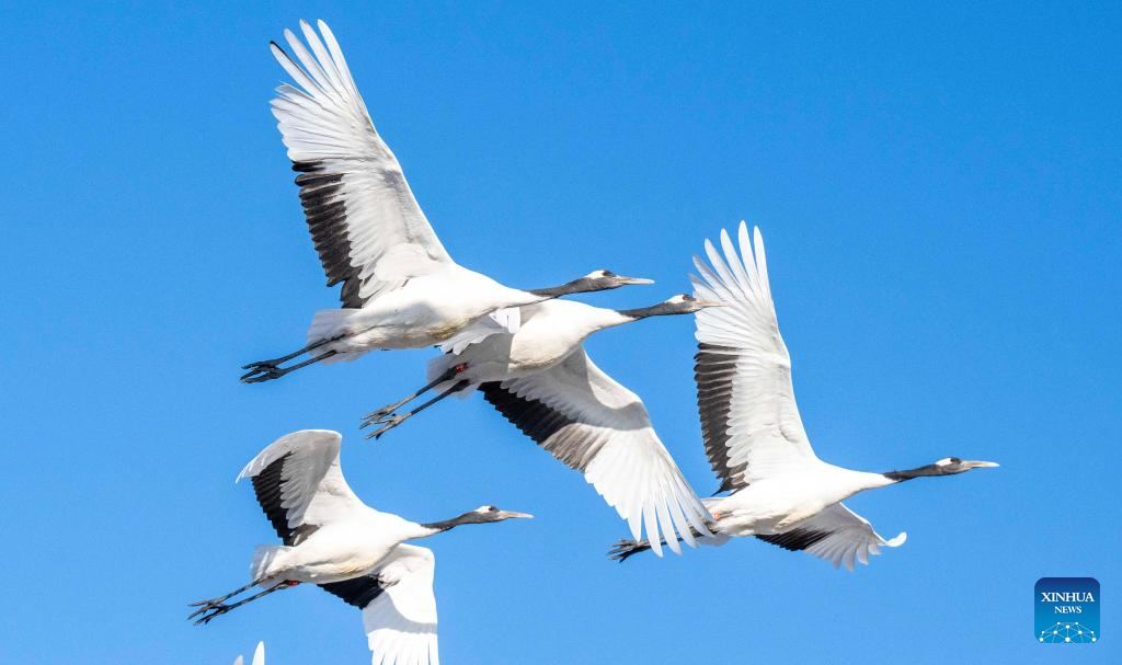 Red-crowned cranes fly at the Zhalong National Nature Reserve in northeast China's Heilongjiang Province, on Jan. 22, 2026. (Photo by He Huawen/Xinhua)