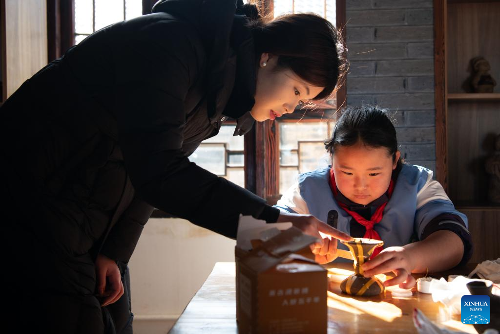 A staff member guides a student to assemble a pottery replica at the Lingjiatan National Archaeological Site Park in Hanshan County, Ma'anshan, east China's Anhui Province, on Jan. 13, 2026. The Lingjiatan relics site in east China's Anhui is a Neolithic settlement dating back 5,300 to 5,800 years, with an area of about 1.6 million square meters.