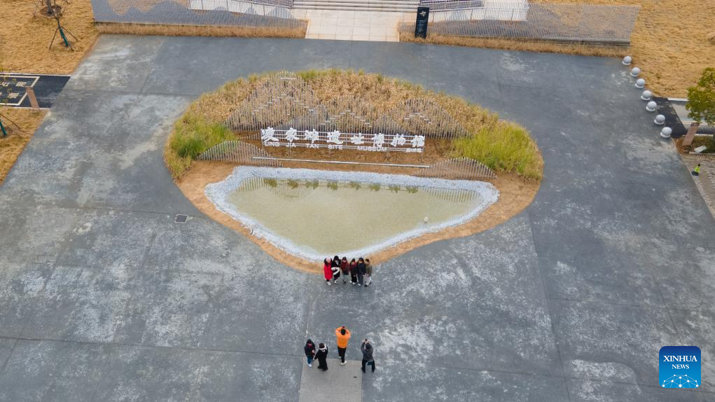 An aerial drone photo taken on Dec. 21, 2025 shows visitors taking photos at the Lingjiatan Site Museum in Hanshan County, Ma'anshan, east China's Anhui Province. The Lingjiatan relics site in east China's Anhui is a Neolithic settlement dating back 5,300 to 5,800 years, with an area of about 1.6 million square meters.