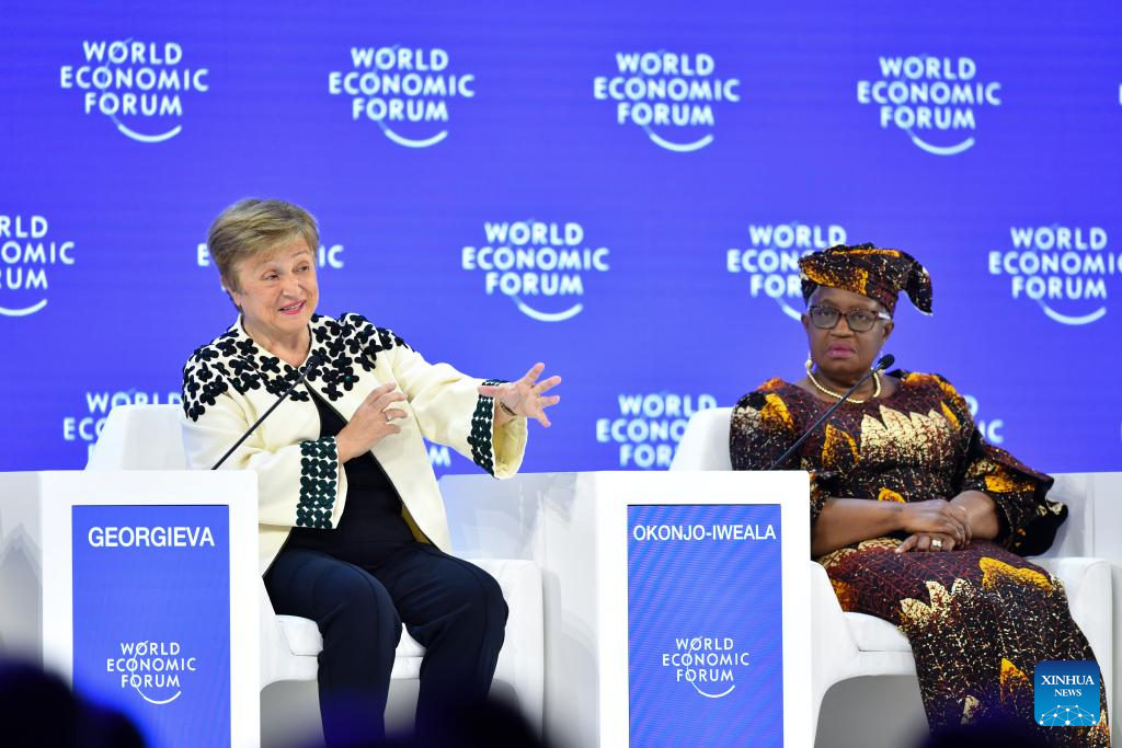 International Monetary Fund Managing Director Kristalina Georgieva (L) speaks at the World Economic Forum (WEF) Annual Meeting 2026 in Davos, Switzerland, Jan. 23, 2026. The WEF concluded its 2026 annual meeting here on Friday. (Xinhua/Lian Yi)