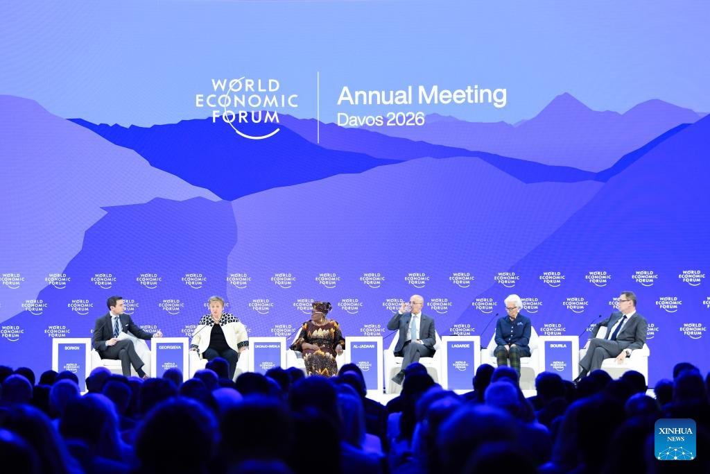 World Trade Organization (WTO) Director-General Ngozi Okonjo-Iweala (3rd L), International Monetary Fund Managing Director Kristalina Georgieva (2nd L), European Central Bank President Christine Lagarde (2nd R), Saudi Finance Minister Mohammed Al Jadaan (3rd R) and Pfizer CEO Albert Bourla (1st R) attend the World Economic Forum (WEF) Annual Meeting 2026 in Davos, Switzerland, Jan. 23, 2026. The WEF concluded its 2026 annual meeting here on Friday. (Xinhua/Lian Yi)