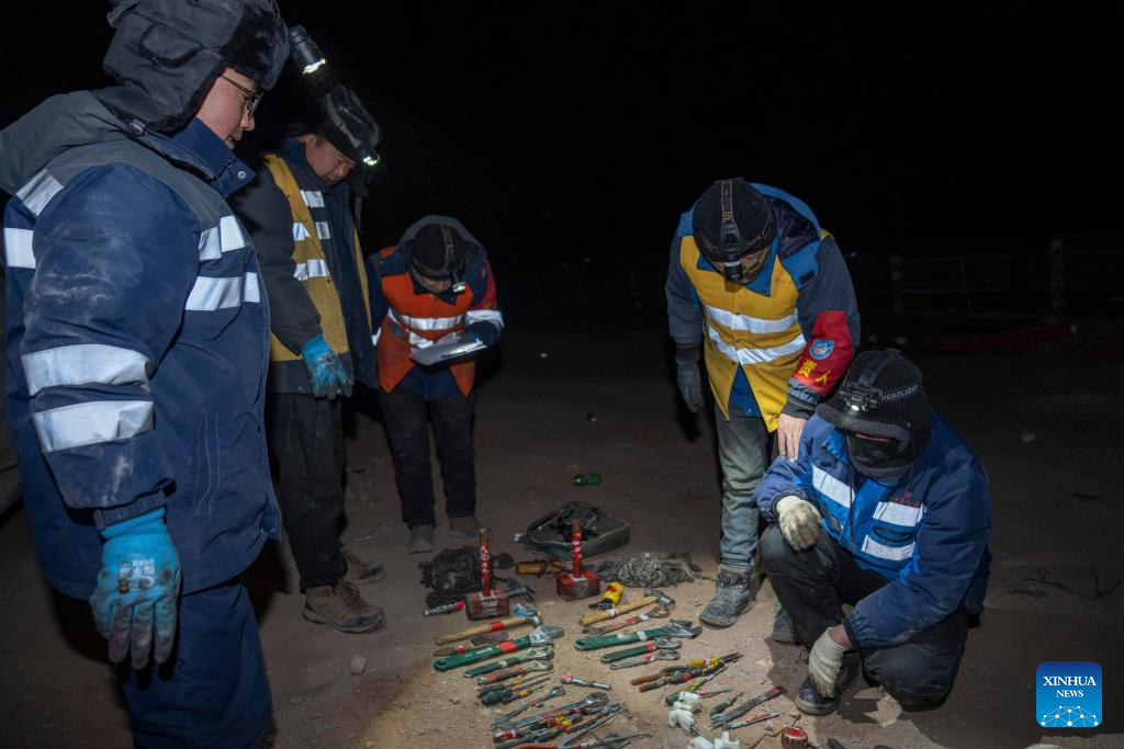Workers count their tools after completing their work in Amdo County, Nagqu, southwest China's Xizang Autonomous Region, Jan. 23, 2026. Perched at an altitude of 4,886 meters, the Za'gya Zangbo signal maintenance section in Amdo County is the world's highest railway signal maintenance section. Fierce winds and bitter cold prevail in the area, where temperatures often drop below minus 30 degrees Celsius.