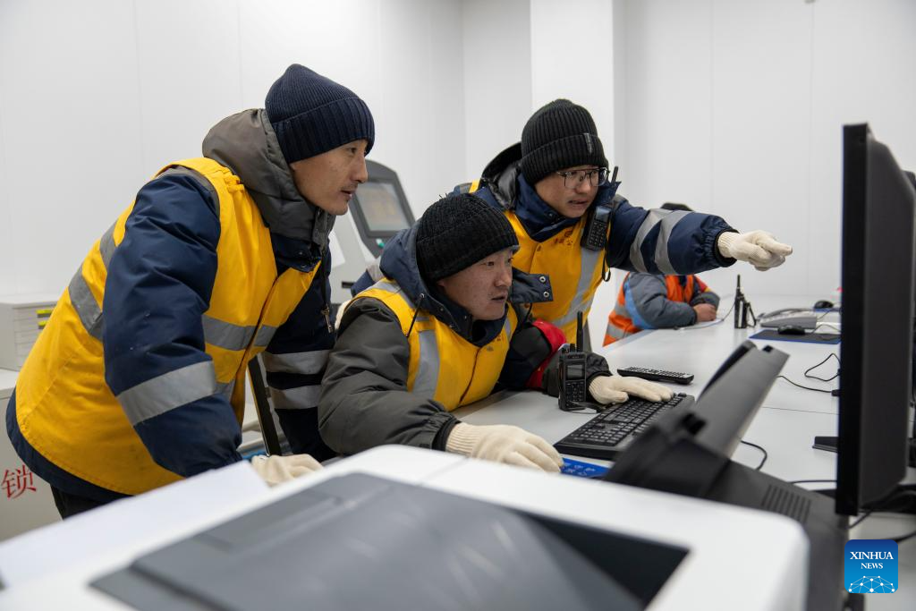 Workers review monitoring data at Za'gya Zangbo signal maintenance section in Amdo County, Nagqu, southwest China's Xizang Autonomous Region, Jan. 24, 2026. Perched at an altitude of 4,886 meters, the Za'gya Zangbo signal maintenance section in Amdo County is the world's highest railway signal maintenance section. Fierce winds and bitter cold prevail in the area, where temperatures often drop below minus 30 degrees Celsius.