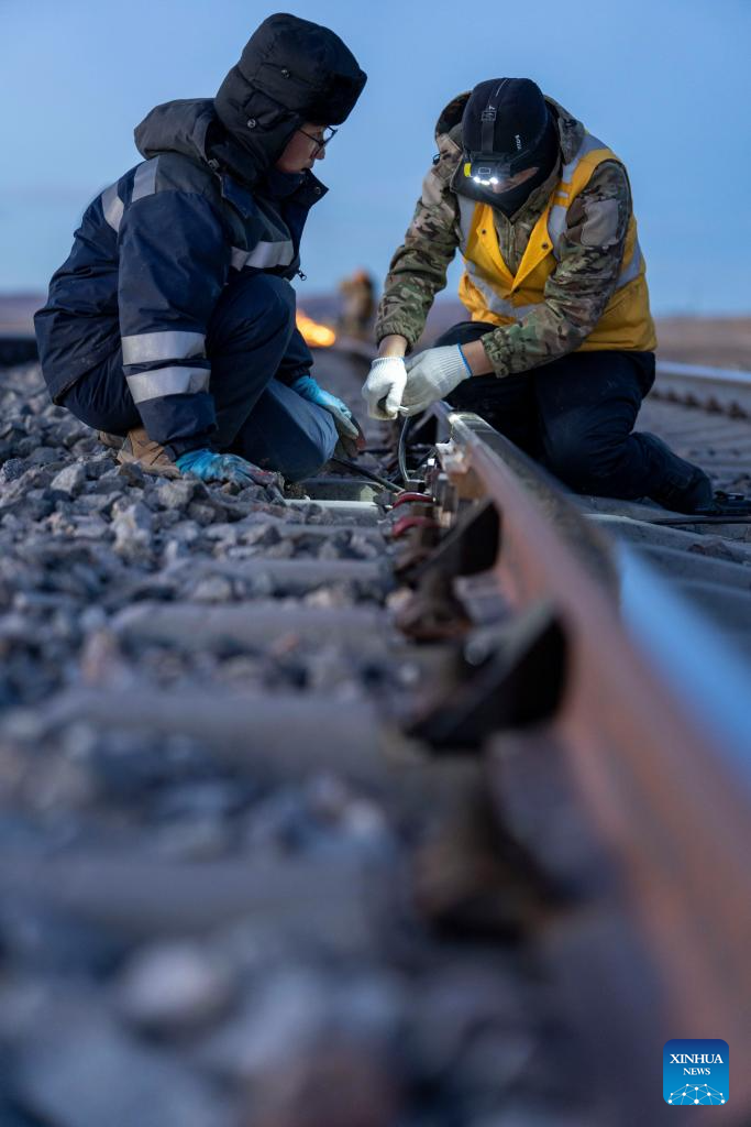 Workers dance Guozhuang, a traditional Tibetan square dance, while waiting for maintenance window operations in Amdo County, Nagqu, southwest China's Xizang Autonomous Region, Jan. 23, 2026. Perched at an altitude of 4,886 meters, the Za'gya Zangbo signal maintenance section in Amdo County is the world's highest railway signal maintenance section. Fierce winds and bitter cold prevail in the area, where temperatures often drop below minus 30 degrees Celsius.