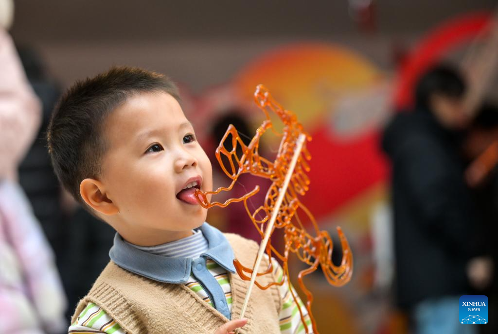 A child tastes a sugar painting during a temple fair for children in north China's Tianjin, on Jan. 24, 2026. A special temple fair tailored for children kicked off in north China's Tianjin on Saturday. Crowds of parents and kids gathered at the fair to experience the festive atmosphere ahead of the Spring Festival. The event features a variety of activities including traditional handicraft making, Tianjin-style food tasting, and interactive games. (Xinhua/Zhao Zishuo)