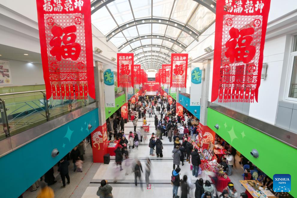 This photo taken on Jan. 24, 2026 shows a scene of a temple fair for children in north China's Tianjin. A special temple fair tailored for children kicked off in north China's Tianjin on Saturday. Crowds of parents and kids gathered at the fair to experience the festive atmosphere ahead of the Spring Festival. The event features a variety of activities including traditional handicraft making, Tianjin-style food tasting, and interactive games. (Xinhua/Zhao Zishuo)