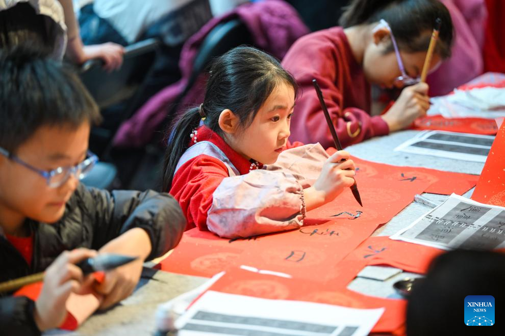 Children write Spring Festival couplets during a temple fair for children in north China's Tianjin, on Jan. 24, 2026. A special temple fair tailored for children kicked off in north China's Tianjin on Saturday. Crowds of parents and kids gathered at the fair to experience the festive atmosphere ahead of the Spring Festival. The event features a variety of activities including traditional handicraft making, Tianjin-style food tasting, and interactive games. (Xinhua/Zhao Zishuo)