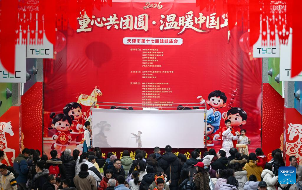 People enjoy a shadow puppet show during a temple fair for children in north China's Tianjin, on Jan. 24, 2026. A special temple fair tailored for children kicked off in north China's Tianjin on Saturday. Crowds of parents and kids gathered at the fair to experience the festive atmosphere ahead of the Spring Festival. The event features a variety of activities including traditional handicraft making, Tianjin-style food tasting, and interactive games. (Xinhua/Zhao Zishuo)