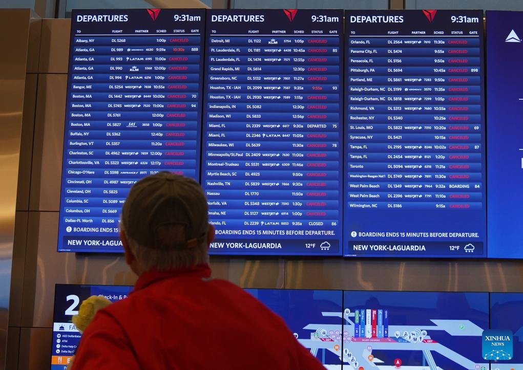 This photo taken on Jan. 25, 2026 shows a screen displaying flight information at LaGuardia Airport in New York, the United States. A historic winter storm is sweeping across the Midwest and eastern parts of the United States on Sunday, causing unprecedented travel chaos. Airlines have canceled 888 flights in and out of LaGuardia Airport in New York City so far on Sunday, 93 percent of the airport's entire-day schedule, local media reported. Meanwhile, over 30,000 flights have been disrupted nationwide, and 21 states have announced State of Emergency, according to Fox Weather. (Xinhua/Zhang Fengguo)