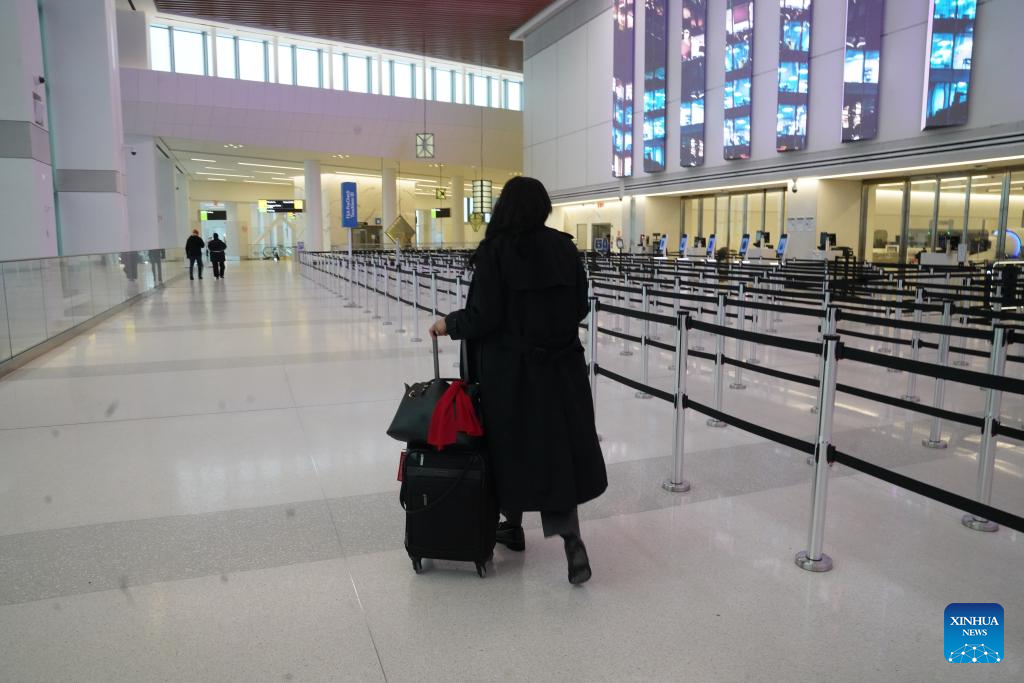 A passenger walks past a check-in area at LaGuardia Airport in New York, the United States, on Jan. 25, 2026. A historic winter storm is sweeping across the Midwest and eastern parts of the United States on Sunday, causing unprecedented travel chaos. Airlines have canceled 888 flights in and out of LaGuardia Airport in New York City so far on Sunday, 93 percent of the airport's entire-day schedule, local media reported. Meanwhile, over 30,000 flights have been disrupted nationwide, and 21 states have announced State of Emergency, according to Fox Weather. (Xinhua/Zhang Fengguo)