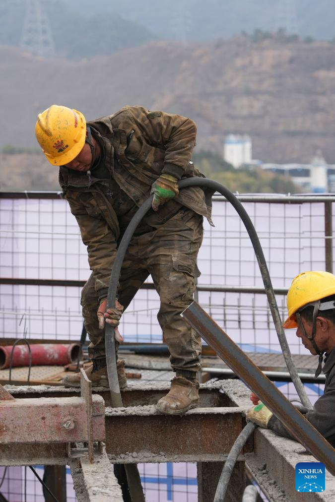 This photo taken on Jan. 25, 2026 shows a constructor working at the concrete pouring site of the crossbeam on the east main tower of the Fuchimen road-rail bridge on the Ningbo-Zhoushan Railway in Zhoushan, east China's Zhejiang Province. The concrete pouring operation for the crossbeam on the east main tower of the Fuchimen road-rail bridge was completed successfully on Sunday, marking a breakthrough in the main tower's primary structure construction and laying a foundation for the subsequent construction of the entire bridge deck system.