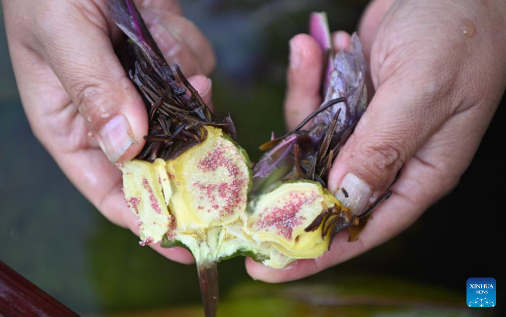 A staff member shows the seeds of a water lily at the Yunxi Botanical Garden in Guangzhou, south China's Guangdong Province, Jan. 27, 2026. Located in the west of the Baiyun Mountain scenic area, the Yunxi Botanical Garden has opened up a display area for water lilies of over 20,000 square meters, where boasts of a variety of water lily species and an introduction, caring and developing team for the plant. (Xinhua/Deng Hua)