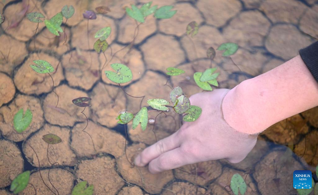 This photo taken on Jan. 27, 2026 shows a staff member checking the growth of water lilies at the Yunxi Botanical Garden in Guangzhou, south China's Guangdong Province. Located in the west of the Baiyun Mountain scenic area, the Yunxi Botanical Garden has opened up a display area for water lilies of over 20,000 square meters, where boasts of a variety of water lily species and an introduction, caring and developing team for the plant. (Xinhua/Deng Hua)