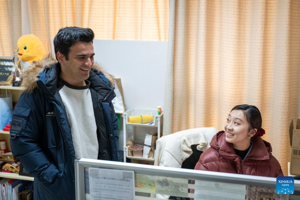 Artem Shishov (L) and his girlfriend Ira Klimena pose for a photo in Suifenhe, northeast China's Heilongjiang Province, Jan. 8, 2026. Artem Shishov from Russia's Vladivostok is a local internet celebrity. He moved to Suifenhe in China's Heilongjiang three years ago and is engaged in foreign trade and tourism-related work. (Xinhua/Zhang Tao)