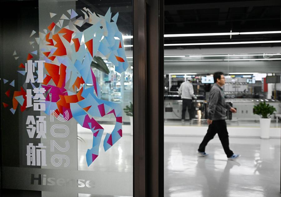 A staff member of Hisense Visual Technology walks past a production line in Qingdao, east China's Shandong Province, Jan. 13, 2026. (Xinhua/Li Ziheng)