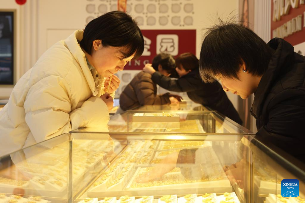 Customers select gold accessories at a gold shop in Yuyue Town, Huzhou City of east China's Zhejiang Province, Jan. 29, 2026. Both the international spot gold price and the April gold futures price on the New York Mercantile Exchange broke through the historical high of 5,500 U.S. dollars per ounce on Jan. 28.