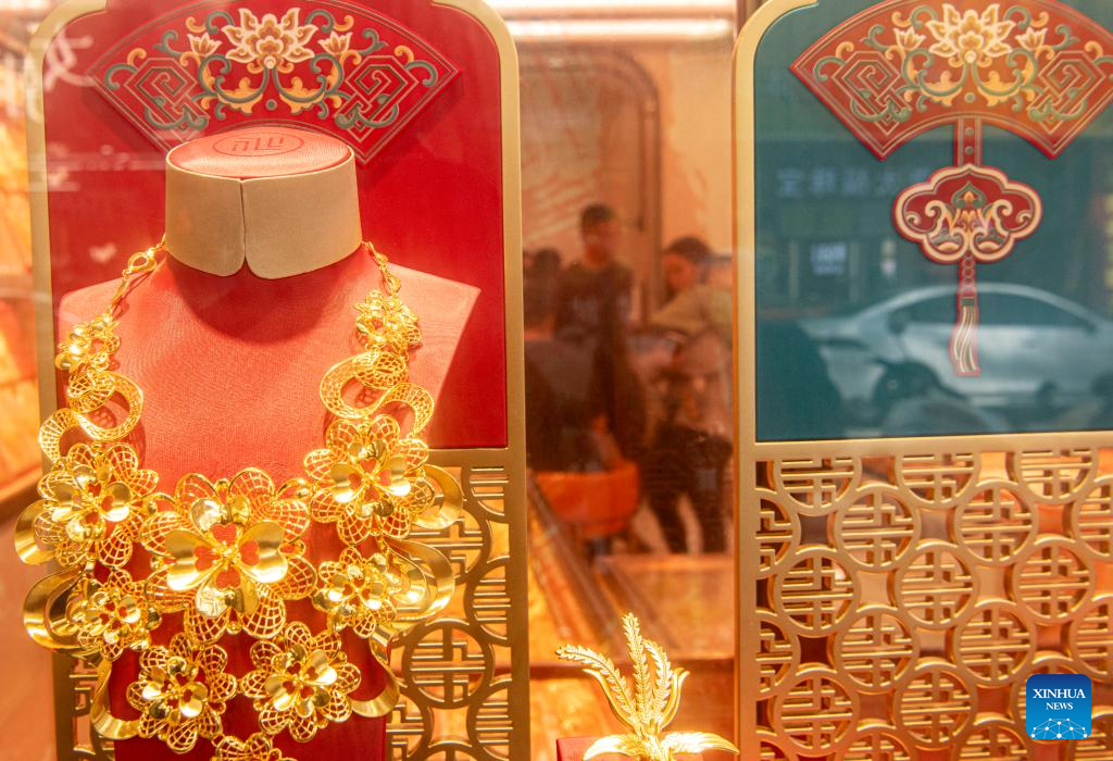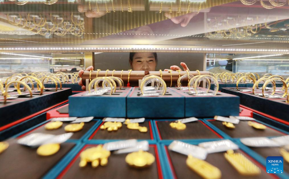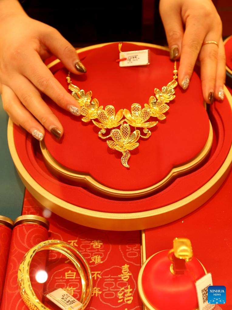 A staff member arranges gold accessories at a gold shop in Yuyue Town, Huzhou City of east China's Zhejiang Province, Jan. 29, 2026. Both the international spot gold price and the April gold futures price on the New York Mercantile Exchange broke through the historical high of 5,500 U.S. dollars per ounce on Jan. 28.