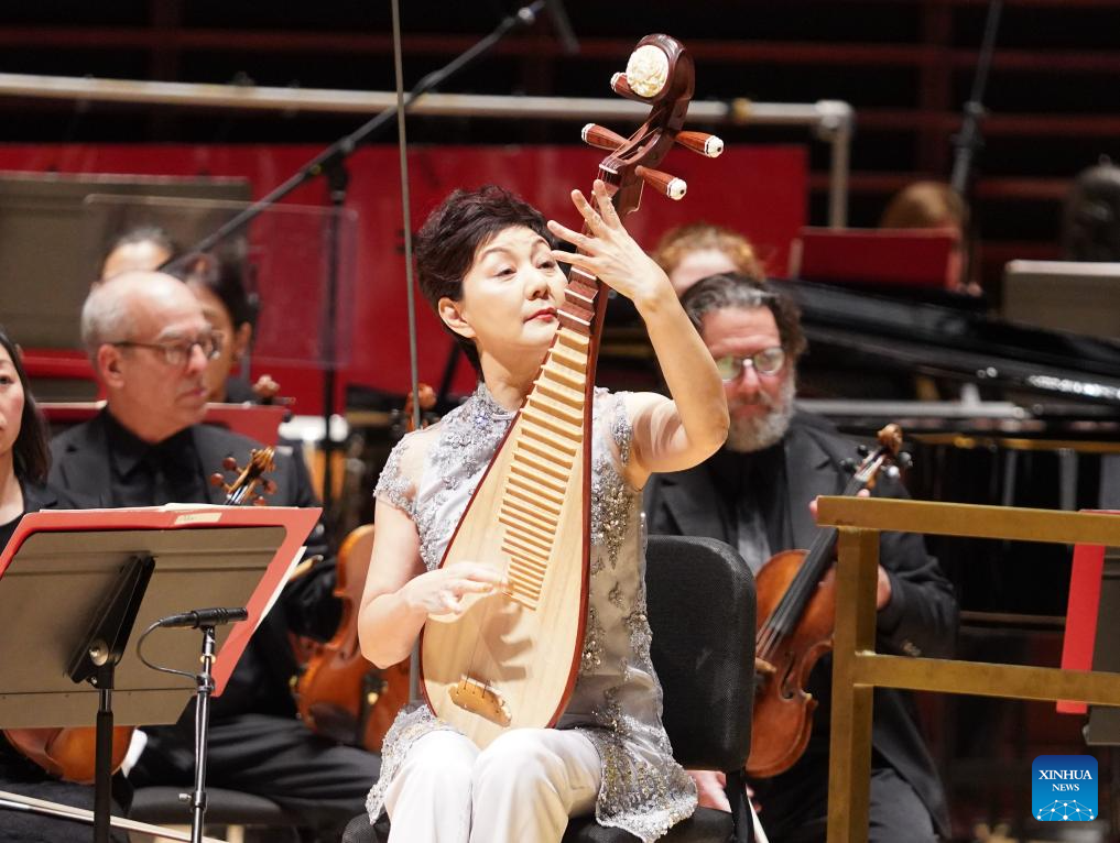 Chinese musician Yu Hongmei performs at a concert for the upcoming Lunar New Year at the Kimmel Center for the Performing Arts in Philadelphia, the United States, Jan. 28, 2026. The Philadelphia Orchestra and the China National Tourist Office in New York marked the upcoming Lunar New Year on Wednesday with a concert and "Ni Hao! China" tourism promotion events at the Kimmel Center for the Performing Arts. (Xinhua/Zhang Fengguo)