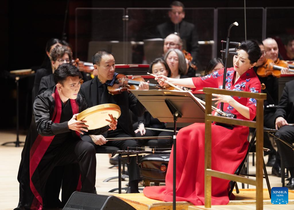 Chinese musician Zhang Hongyan performs at a concert for the upcoming Lunar New Year at the Kimmel Center for the Performing Arts in Philadelphia, the United States, Jan. 28, 2026. The Philadelphia Orchestra and the China National Tourist Office in New York marked the upcoming Lunar New Year on Wednesday with a concert and "Ni Hao! China" tourism promotion events at the Kimmel Center for the Performing Arts. (Xinhua/Zhang Fengguo)
