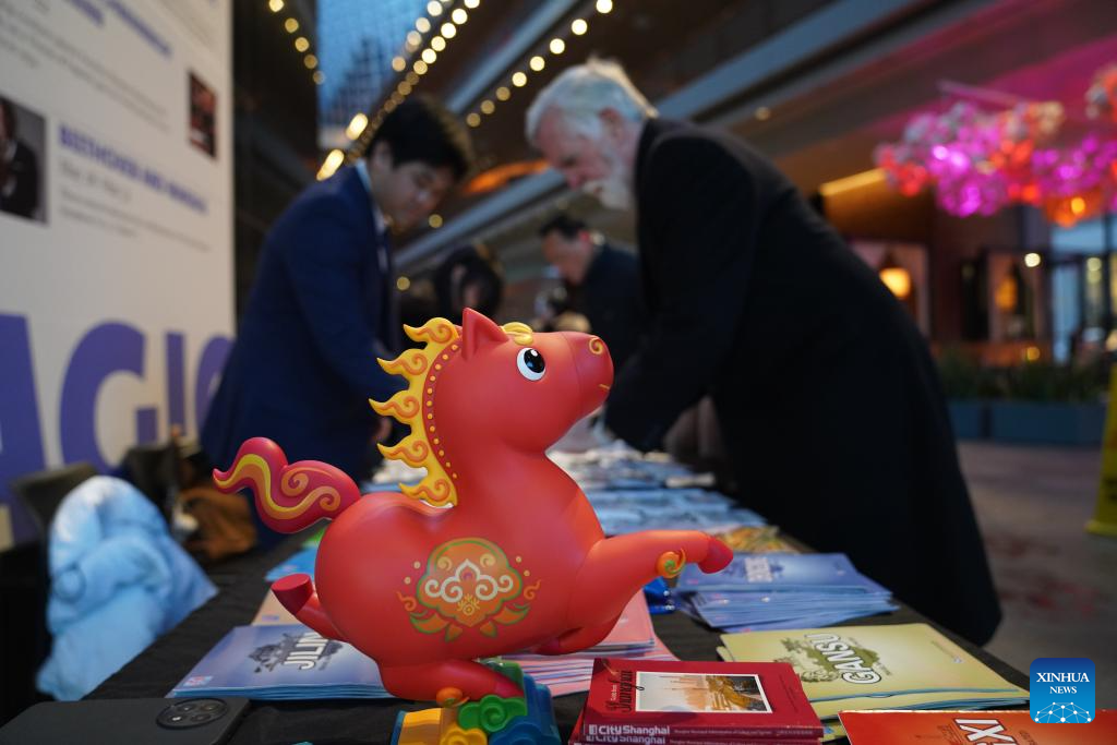 A horse mascot is seen on a check-in desk during the "Ni Hao! China" tourism promotion events at the Kimmel Center for the Performing Arts in Philadelphia, the United States, Jan. 28, 2026. The Philadelphia Orchestra and the China National Tourist Office in New York marked the upcoming Lunar New Year on Wednesday with a concert and "Ni Hao! China" tourism promotion events at the Kimmel Center for the Performing Arts. (Xinhua/Zhang Fengguo)