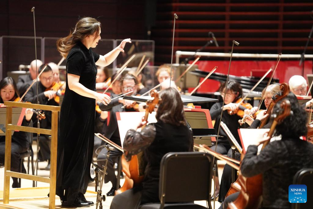 Canadian conductor Naomi Woo performs at a concert for the upcoming Lunar New Year at the Kimmel Center for the Performing Arts in Philadelphia, the United States, Jan. 28, 2026. The Philadelphia Orchestra and the China National Tourist Office in New York marked the upcoming Lunar New Year on Wednesday with a concert and "Ni Hao! China" tourism promotion events at the Kimmel Center for the Performing Arts. (Xinhua/Zhang Fengguo)