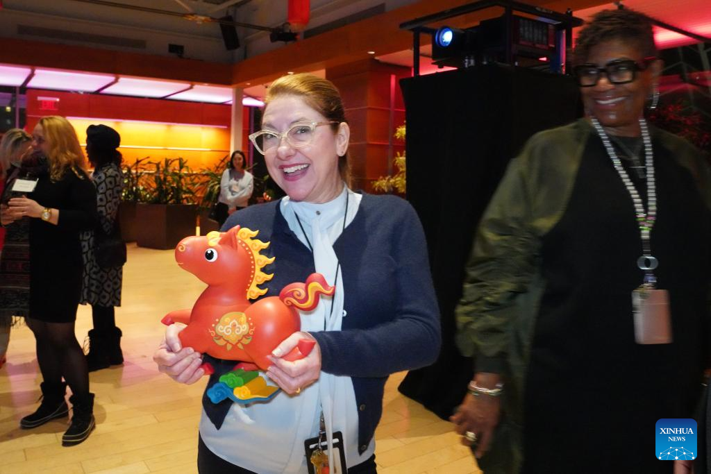 A woman displays a horse mascot during the "Ni Hao! China" tourism promotion events at the Kimmel Center for the Performing Arts in Philadelphia, the United States, Jan. 28, 2026. The Philadelphia Orchestra and the China National Tourist Office in New York marked the upcoming Lunar New Year on Wednesday with a concert and "Ni Hao! China" tourism promotion events at the Kimmel Center for the Performing Arts. (Xinhua/Zhang Fengguo)