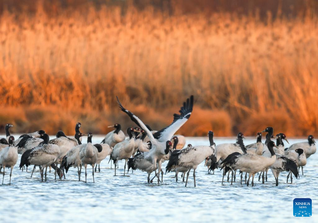This photo taken on Jan. 29, 2026 shows black-necked cranes at Caohai National Nature Reserve in Weining County, southwest China's Guizhou Province. (Xinhua/Yang Wenbin)