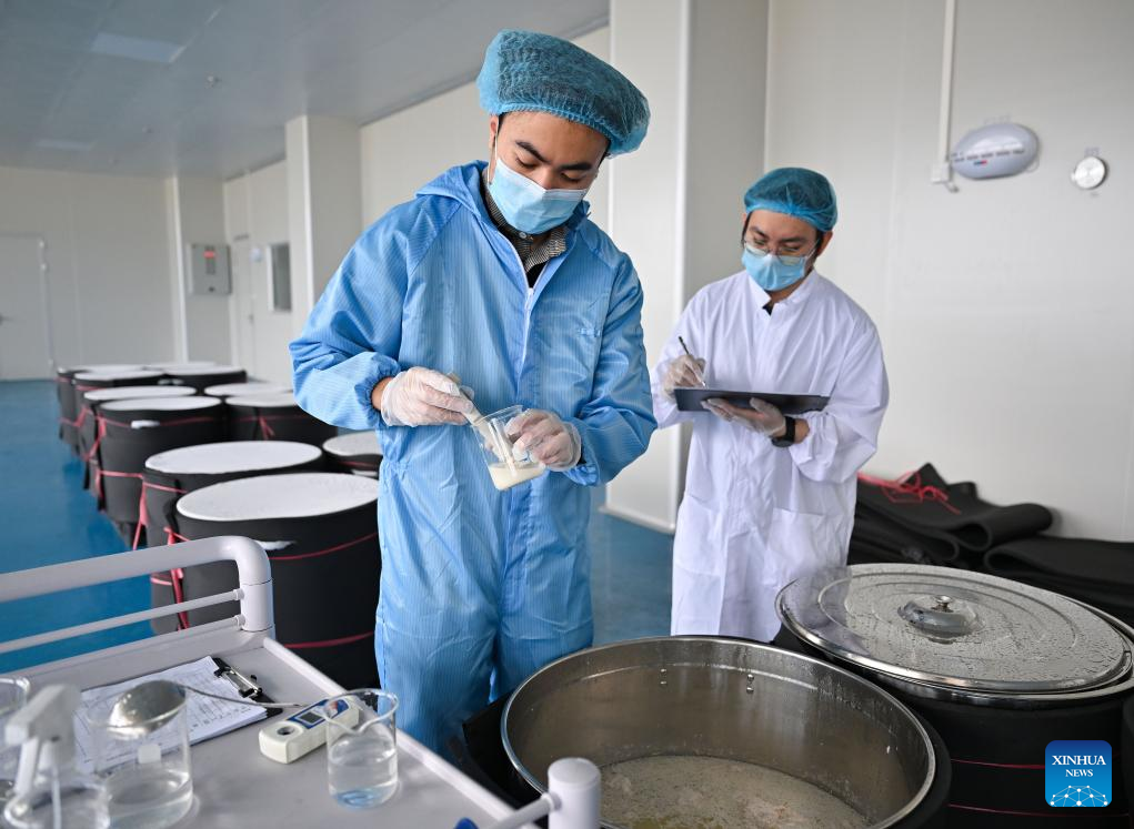 A staff member collects samples of zaopo vinegar for testing at a factory in Wenchang City, south China's Hainan Province, Jan. 28, 2026. Zaopo vinegar, a traditional specialty of Puqian Town in Wenchang City, has seen industrial growth in recent years as traditional brewing techniques are combined with modern standardized production, helping promote cultural-tourism integration and increase local income. (Xinhua/Guo Cheng)