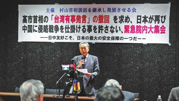 Japanese former prime minister Yukio Hatoyama delivered a speech at a rally on Thursday, warning that Takaichi's refusal to retract the statements has heightened regional tensions. XINHUA