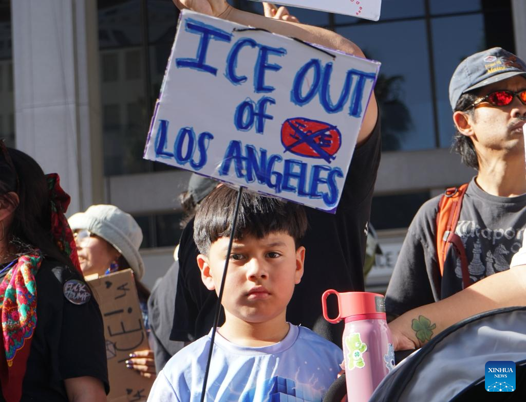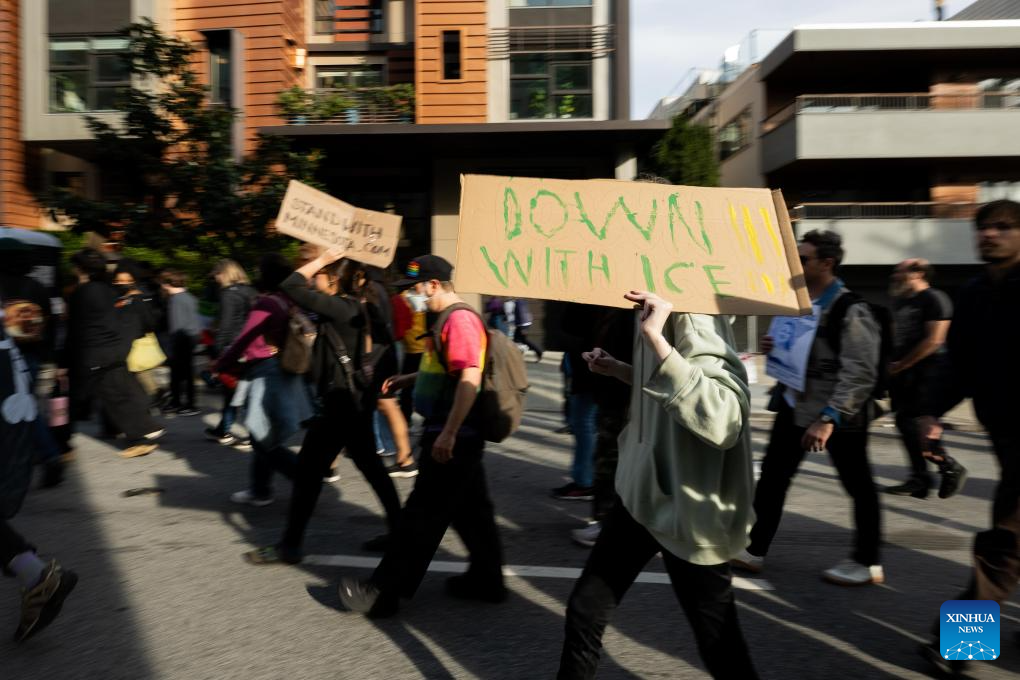 Rachel Elder, who attended a protest with her son, told Xinhua she was demonstrating against what she described as unlawful violence by ICE agents. "I'm here with my son because we are protesting the occupation of ICE and the unlawful violence, murder that the agents have committed against innocent protesters," she said.